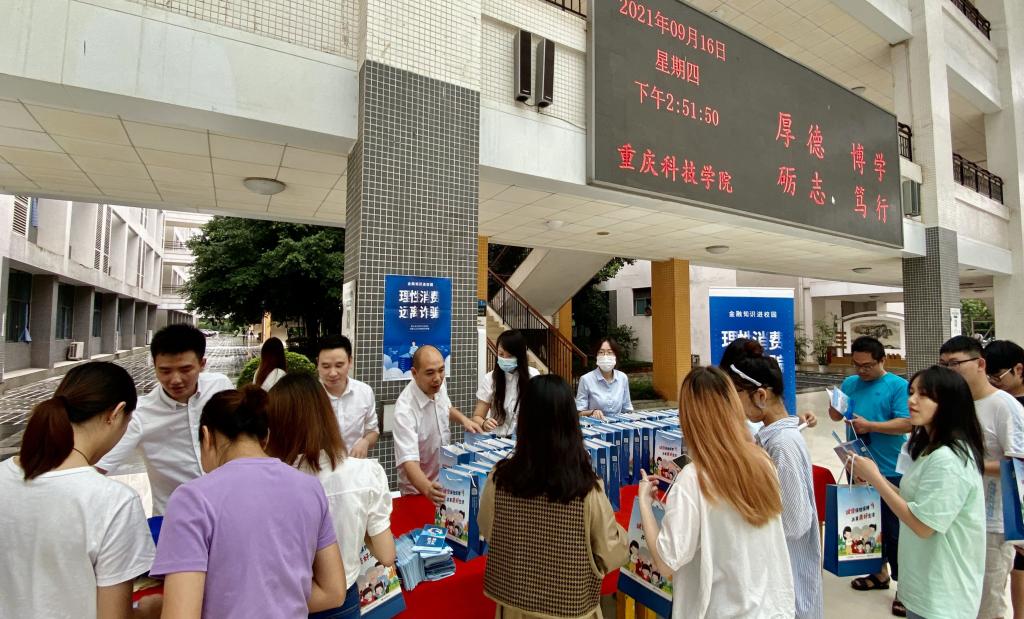 安盛天平财产保险有限公司重庆分公司、中邮人寿保险股份有限公司重庆分公司、浦发银行西永支行、中国银行高新分行、重庆农村商业银行科学城支行等5家金融机构在教学主楼大厅开展了金融反诈知识咨询宣传活动,现场发放金融知识手册,指导同学们如何辨别金融陷阱、远离不良“校园贷”等。