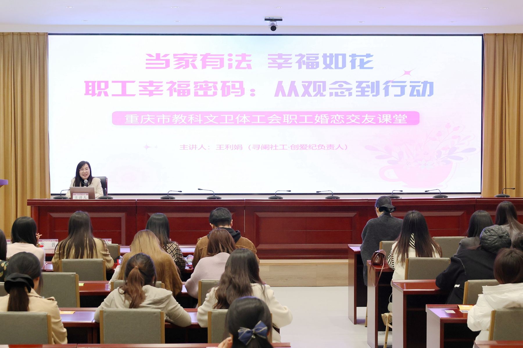 为主动适应新时代职工需求,更好地为单身职工服务,11月13日,由重庆市教科文卫体工会主办,我校协办的职工婚恋交友课堂暨女职工素质提升活动在我校举行。重庆市教科文卫体工会常务副主席张晋,学校党委常委、副校长朱永利,以及市教科文卫体工会、学校工会相关负责同志出席了活动。来自重庆市教科文卫体系统所属基层单位未婚单身职工及红娘参加本次活动。