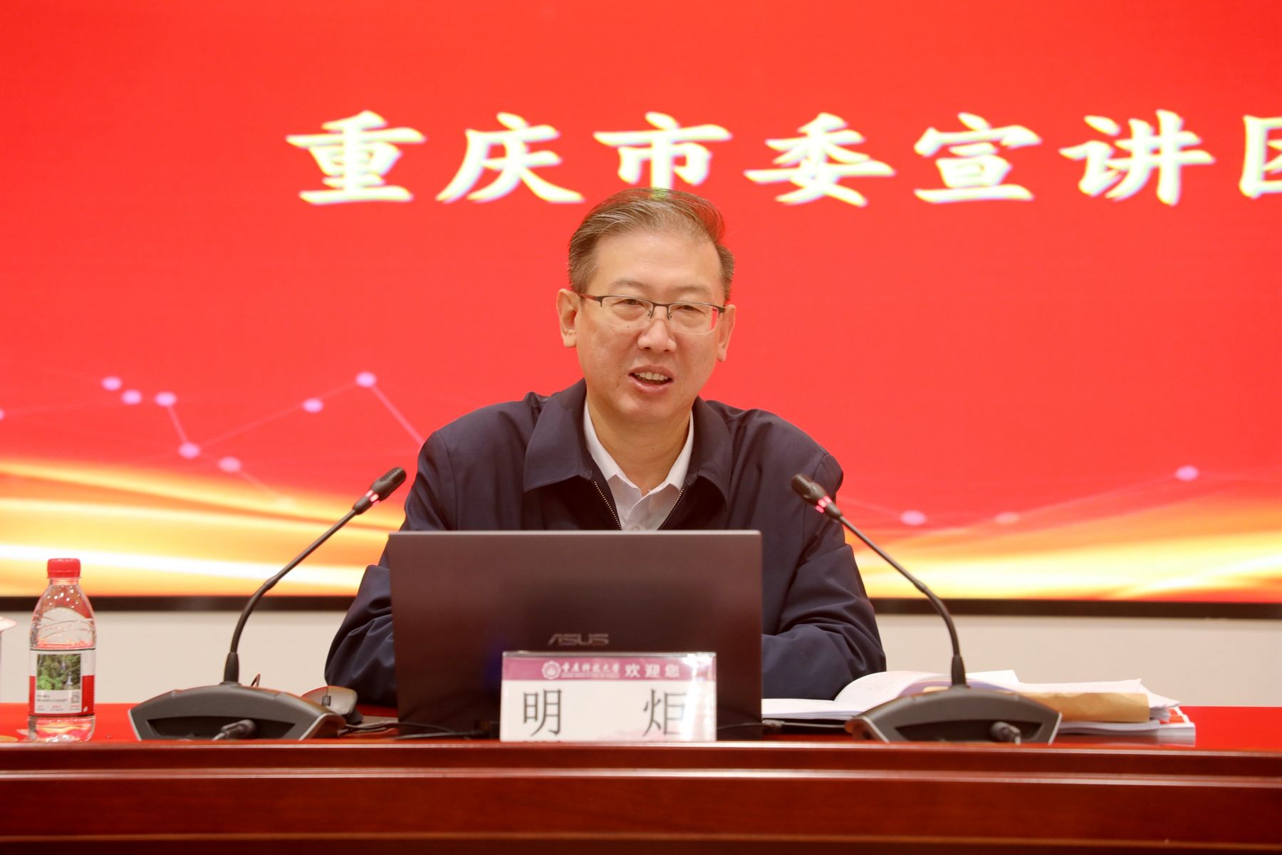 报告会上,明炬紧紧围绕学习贯彻习近平总书记在党的二十届四中全会上的重要讲话精神和全会审议通过的《中共中央关于制定国民经济和社会发展第十五个五年规划的建议》,从党的二十届四中全会召开的时代背景与重大意义、准确把握“十五五”时期在基本实现社会主义现代化进程中的重要地位、深刻领会“十五五”时期经济社会发展的指导方针和主要目标、全面理解“十五五”时期经济社会发展的战略任务和重大举措、坚持和加强党的全面领导以凝聚推进中国式现代化的磅礴力量、对标对表深谋实干以体系化推动四中全会精神在重庆一贯到底六个方面,对全会精神作了系统阐述和深入解读。明炬还结合我校办学定位,强调高校在人才培养、基础研究、成果转化、产学研协同创新中的重要作用,鼓励学校主动对接重庆“33618”现代制造业集群和“416”科技创新布局,为地方科技创新和产业升级贡献高校力量。