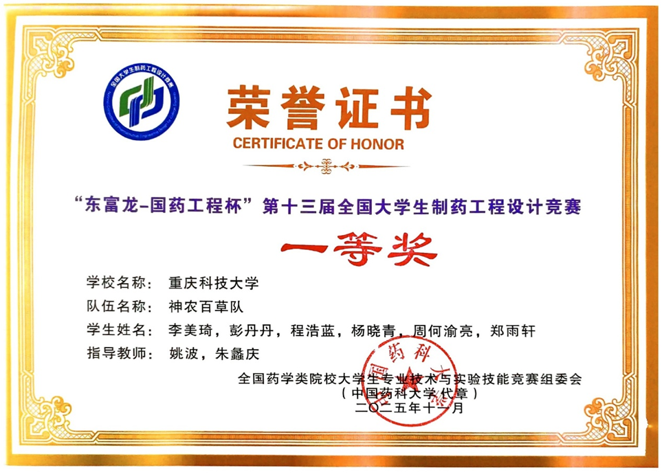 11月30日,第十三届全国大学生制药工程设计竞赛全国总决赛在上海工程技术大学落幕,我校化学化工学院制药工程专业2023级本科生李美琦、彭丹丹、程浩蓝、杨晓青、周何渝亮和郑雨轩六位同学组成的“神农百草”团队从来自全国174所高校的364支团队中脱颖而出,勇夺一等奖。此外,我校还有两支队伍分别获得二等奖和三等奖。