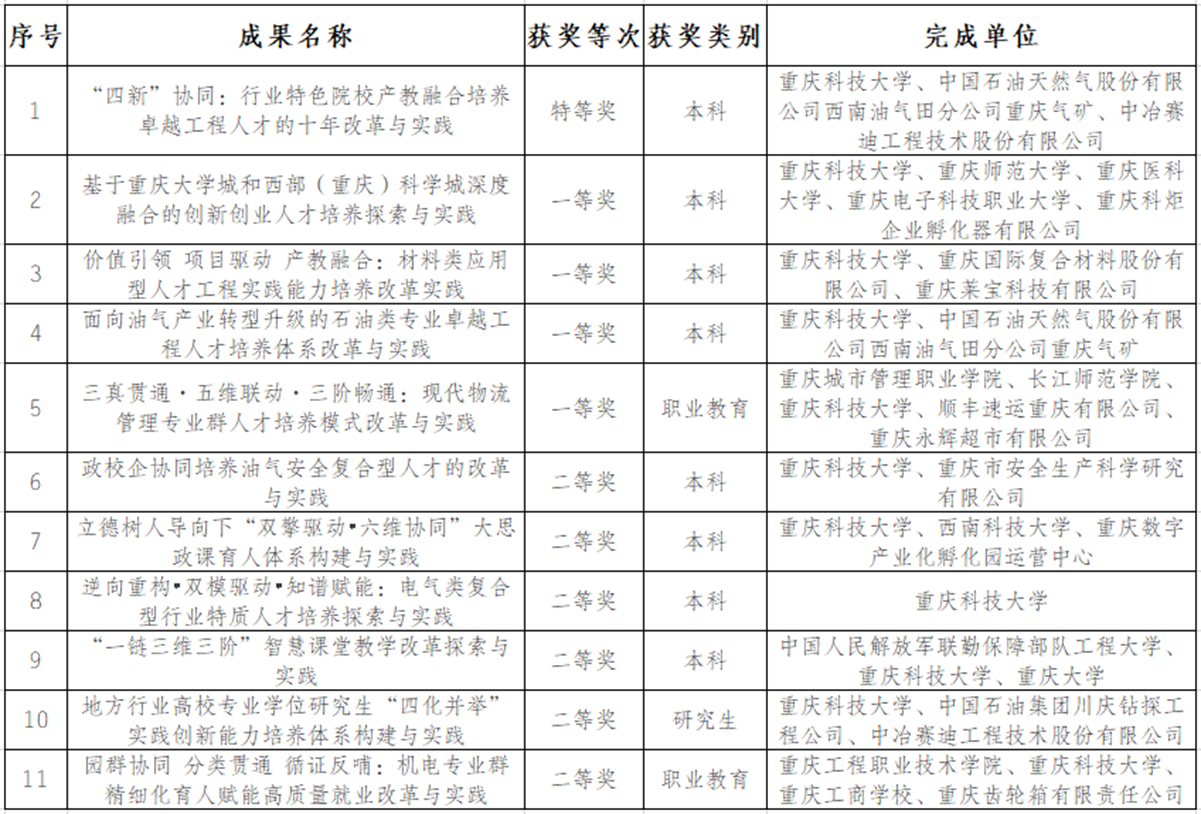 近日,重庆市人民政府发布了《关于2025年重庆市教学成果奖励的决定》,我校共获得奖励11项,以第一完成单位获得8项,其中特等奖1项、一等奖3项、二等奖4项;作为主要合作单位获得3项,其中一等奖1项、二等奖2项。获奖层次与数量均创学校历史新高,充分展现了学校高质量人才培养体系建设的显著成效。
