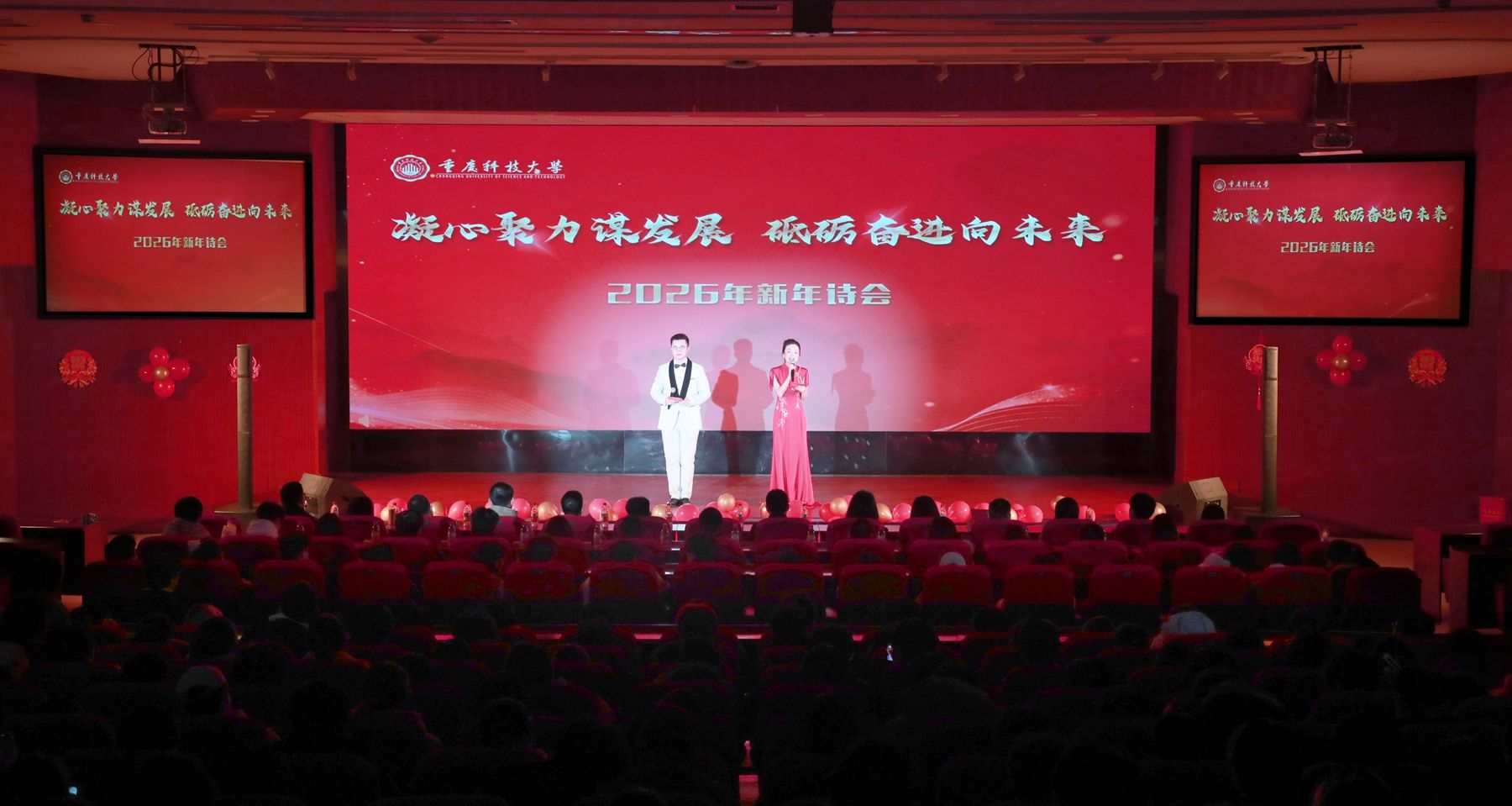 1月9日晚,由党委宣传部主办,石油与天然气工程学院党总支承办的“凝心聚力谋发展 砥砺奋进向未来”学校2026年新年诗会在学术报告厅圆满举行。学校相关职能部门、各党总支负责人,14个参演单位演职人员和师生代表共计400余人齐聚一堂,共赏诗意盛宴,共话发展愿景。