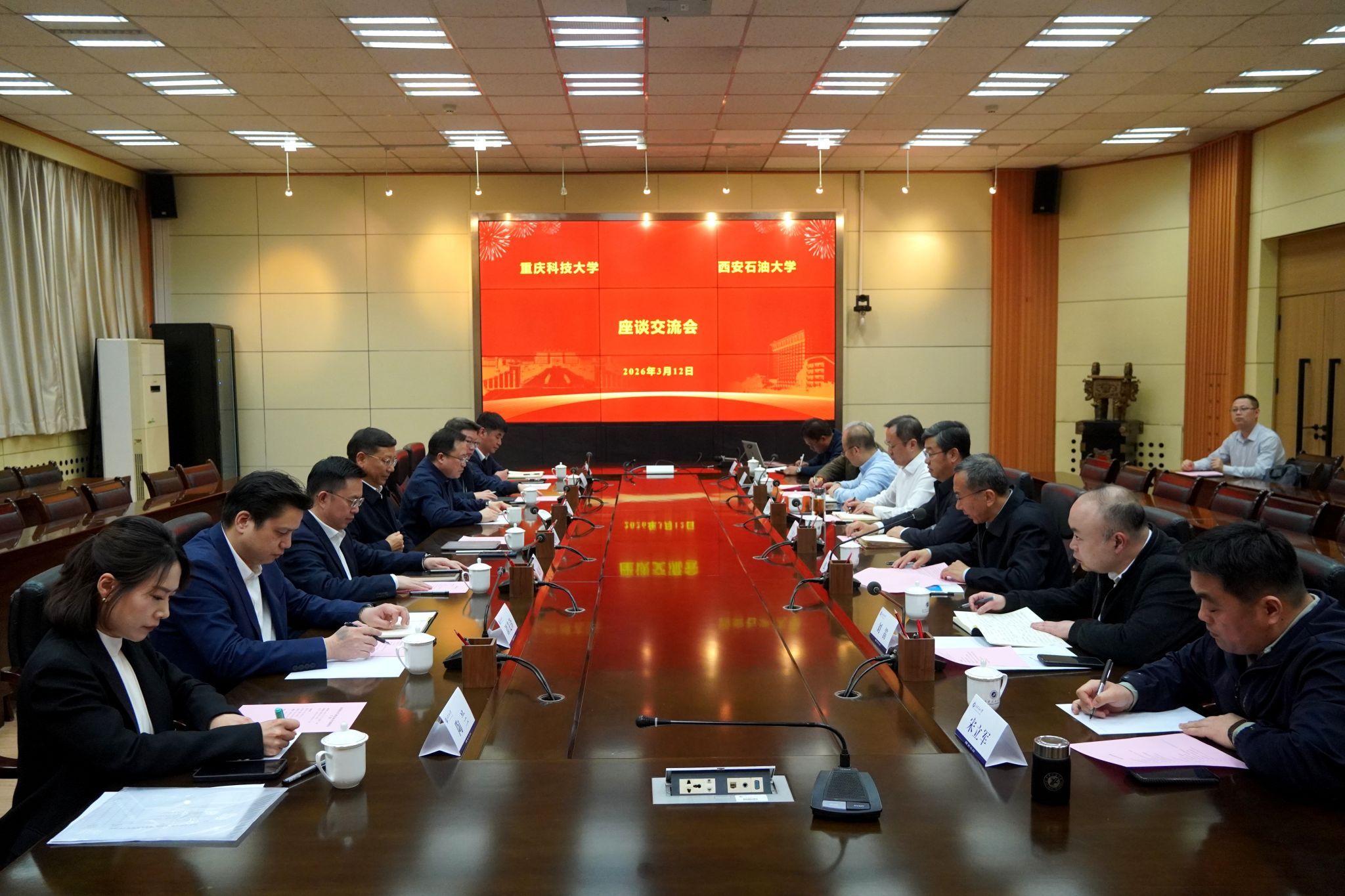 会上,王进富对赵明阶一行表示热烈欢迎,并介绍了学校历史沿革与发展现状。他高度认可重庆科技大学在服务国家战略和行业发展方面取得的成绩,尤其是在油气与冶金领域形成的学科特色,以及产教融合、应用型人才培养方面的积极探索。王进富校长表示,两校渊源深厚、同属服务国家能源战略的行业特色高校,分别扎根西南与西北,使命相通,期待以此次交流为起点,双方进一步增进互动、深化合作,共同为国家能源事业发展和西部高等教育提升作出更大贡献。