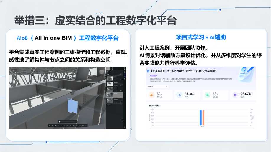 三是搭建数字化实践教学平台。课程团队自主开发AioB工程数字化平台,整合海量真实工程案例,搭建三维交互结构模型,将抽象的二维图纸转化为具象的三维实体,让学生更直观地感受工程现场,进一步破解理论与实践脱节难题。