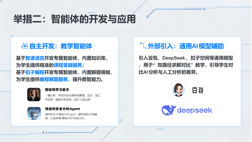 二是研发专属智能教学工具。采用“自主开发+外部引入”模式,打造“结构安全分析”“钢结构学习助手”两款教学智能体,同步引入行业通用AI工具,创新开展“双路径求解对比”教学,引导学生理性使用AI工具,培养批判性思维和数智决策能力。