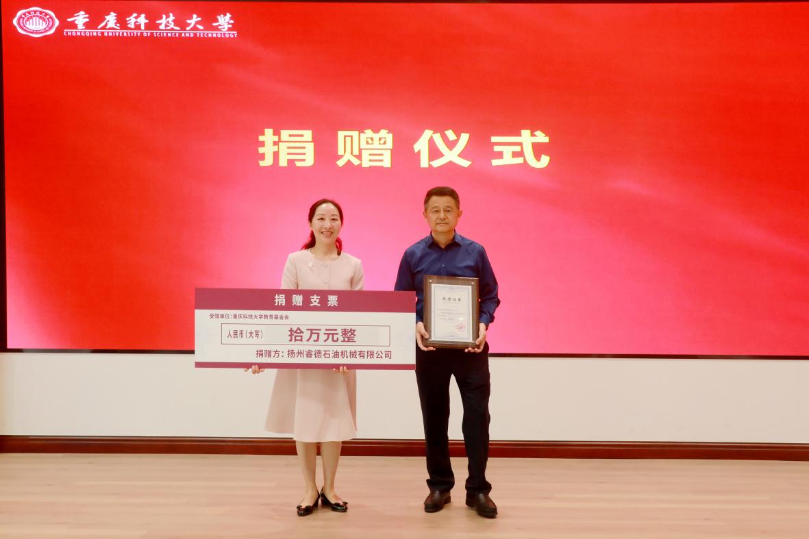 蒋立新介绍了扬州睿德石油机械有限公司的发展情况及校企合作构想,他回顾了在母校求学时的青葱岁月,分享了职业道路上的磨砺与感悟。他表示,在母校设立“扬州睿德思源石油文化基金”,既是饮水思源的感恩之行,更是一场校友与母校间的“双向奔赴”,愿以绵薄之力激励学弟学妹奋发成才,让这份跨越时光的情谊薪火相传。