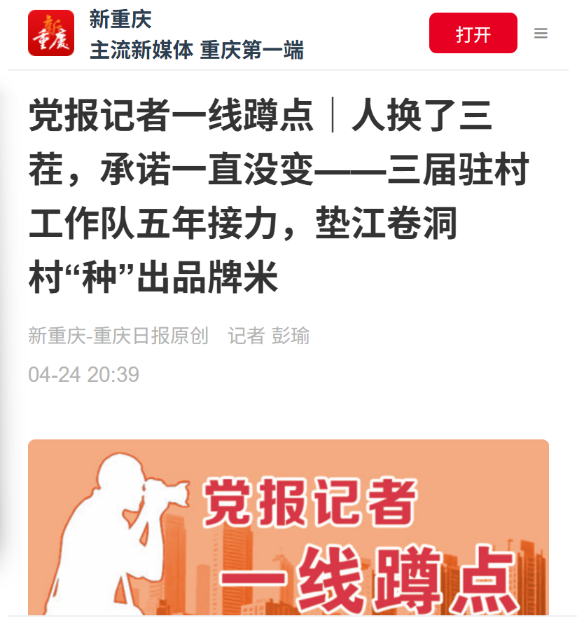 4月中旬,《重庆日报》记者走进卷洞村,深入调研五年来当地产业发展的巨大变化。4月27日,《重庆日报》以《三届驻村工作队,五年接力不断档——垫江卷洞村种出优质品牌大米》为题,4月24日,“新重庆”客户端以《人换了三茬,承诺一直没变——三届驻村工作队五年接力,垫江卷洞村“种”出品牌米》为题,先后报道了我校三届驻村工作队五年持续助力乡村振兴的感人事迹与显著成效。