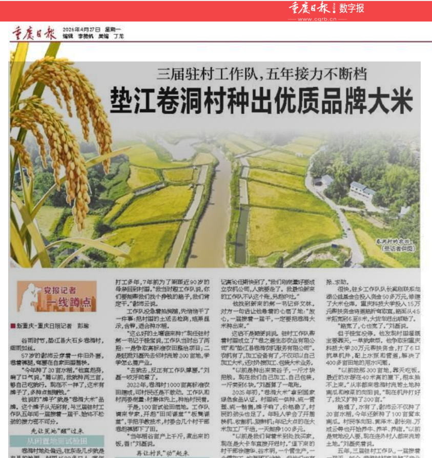 《重庆日报》:三届驻村工作队,五年接力不断档——垫江卷洞村种出优质品牌大米