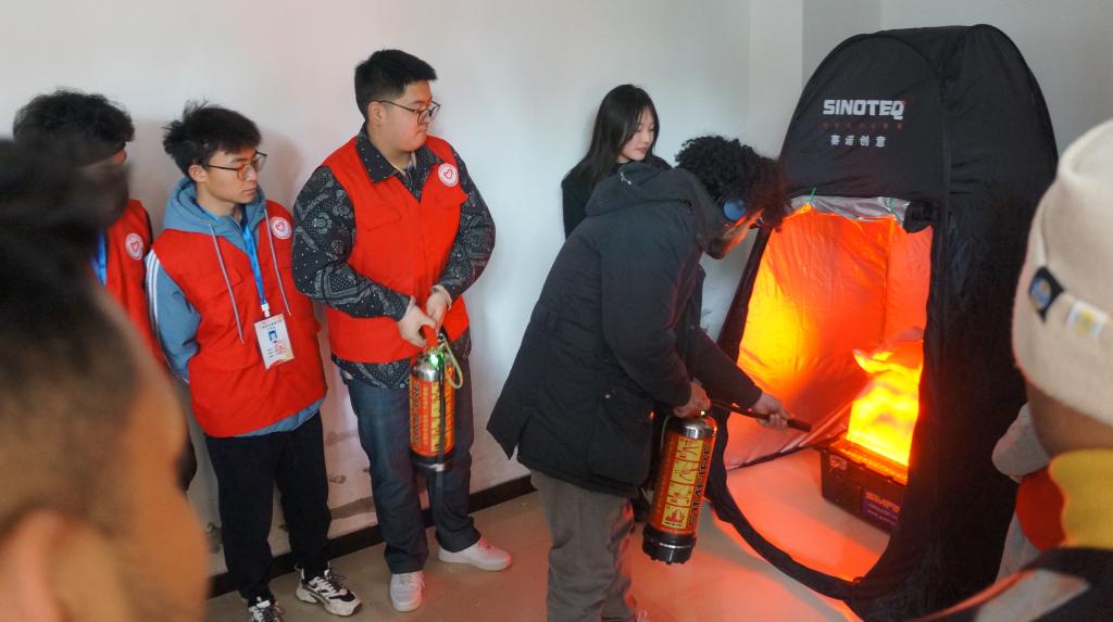 培训中,消防志愿者向留学生讲解了火灾安全自救常识,以及常用消防器材的种类和使用方法。全体国际学生在消防志愿者的带领下,使用模拟灭火器进行灭火体验,掌握了灭火器的正确使用方法。