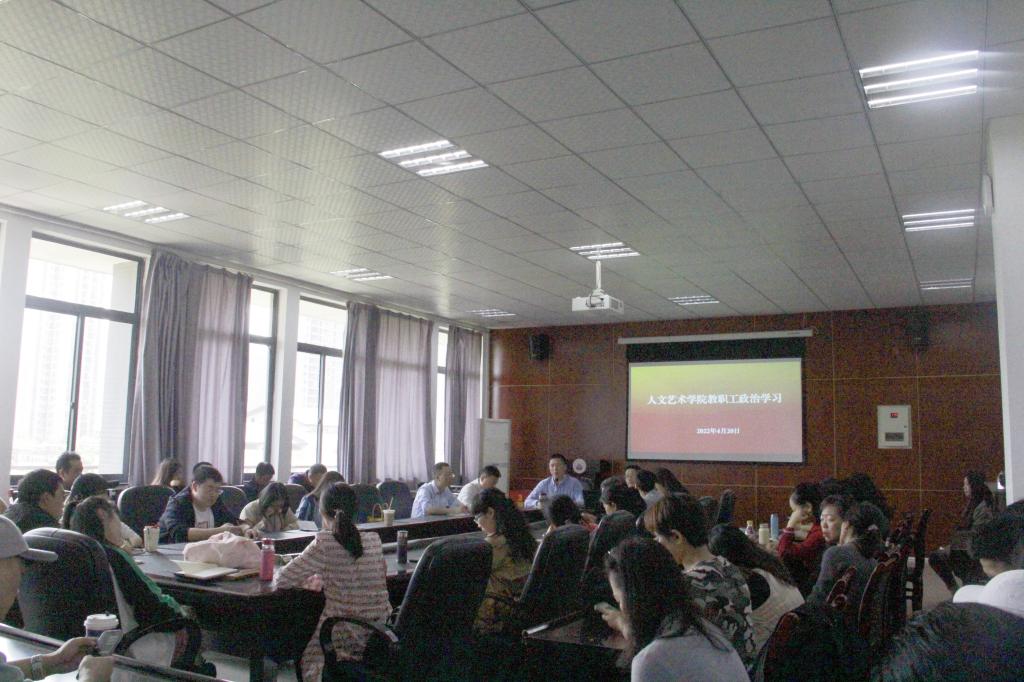 4月20日下午,在厚德楼H512会议室, 人文艺术学院组织教职工政治学习和部署近期工作。全院教职工参加会议,党总支书记余学兵主持。