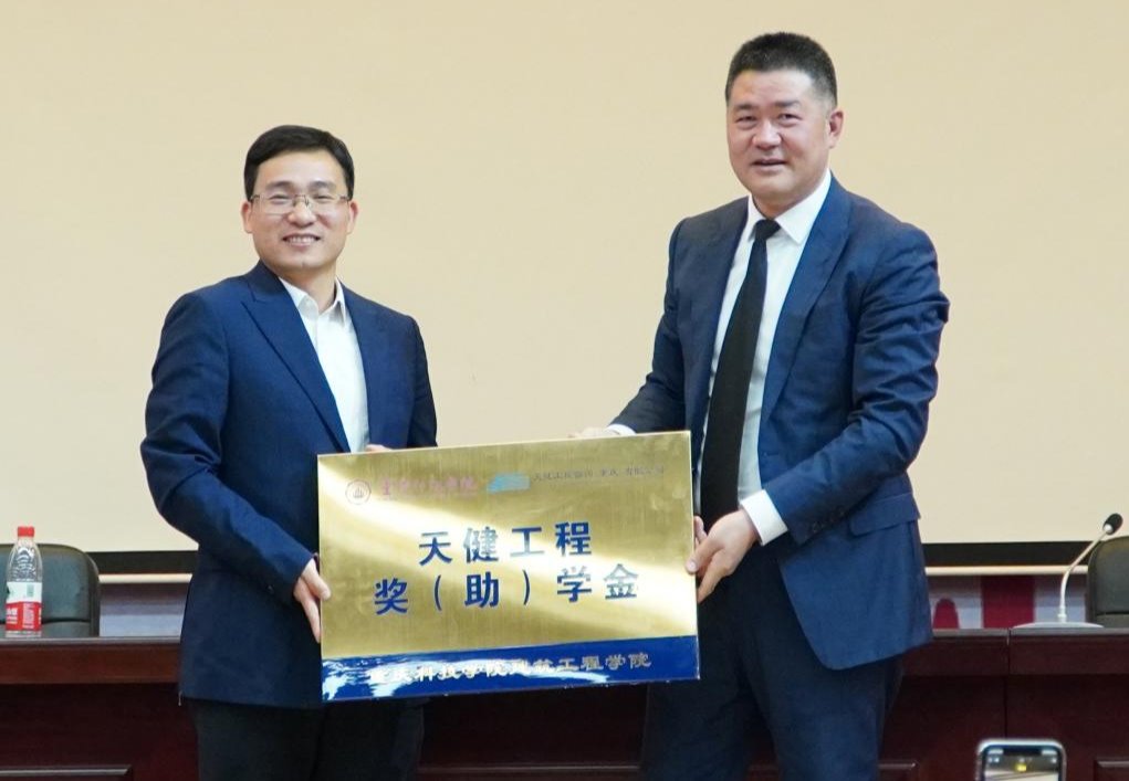 晏致涛在启动仪式上代表学院对天健工程奖(助)学金的设立及“天健班”启动表示热烈祝贺,向支持学院办学发展的天健工程咨询(重庆)有限公司表示衷心感谢。晏致涛从教学科研、师资力量、学生发展等方面介绍了学院的基本情况和工程管理、工程造价两个专业的具体发展情况,强调了深化产教融合、增强校企合作的重要意义,提出了对未来双方共谋发展的期望,并对有意愿申请进入“天健班”学习的同学们提出三点要求:一要励志笃行,不负韶华;二要严格自律,认真学习;三要德才兼备,知行合一。会上,双方互授了产学合作实践教学基地与天健工程奖(助)学金的牌匾。