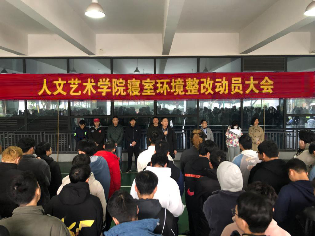 为进一步规范寝室管理,培养学生良好的生活习惯,营造安全整洁、文明有序的寝室学习生活环境,人文艺术学院于11月21日上午在体育馆前举行人文艺术学院学生寝室环境整改动员大会。人文艺术学院党总支书记余学兵、院长杨恩德、党总支副书记王文博、正处级组织员叶怀平以及全体专兼职辅导员全院男生参加此次活动。