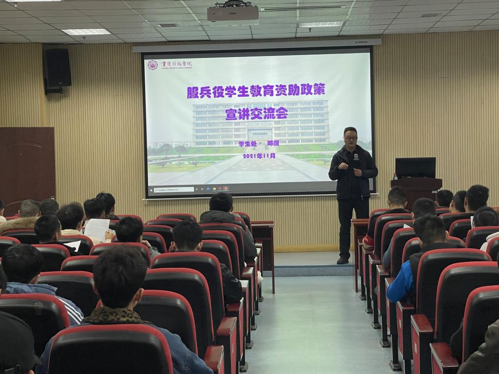 11月25日下午,为了让入伍服兵役在校学生及时了解国家教育资助政策,学校资助中心在大学生就业服务中心宣讲厅1举行2021年服兵役学生教育资助政策宣讲交流会。退役复(入)学的在校学生60余人参加了此次宣讲会,学生处副处长邓艇进行了宣讲。