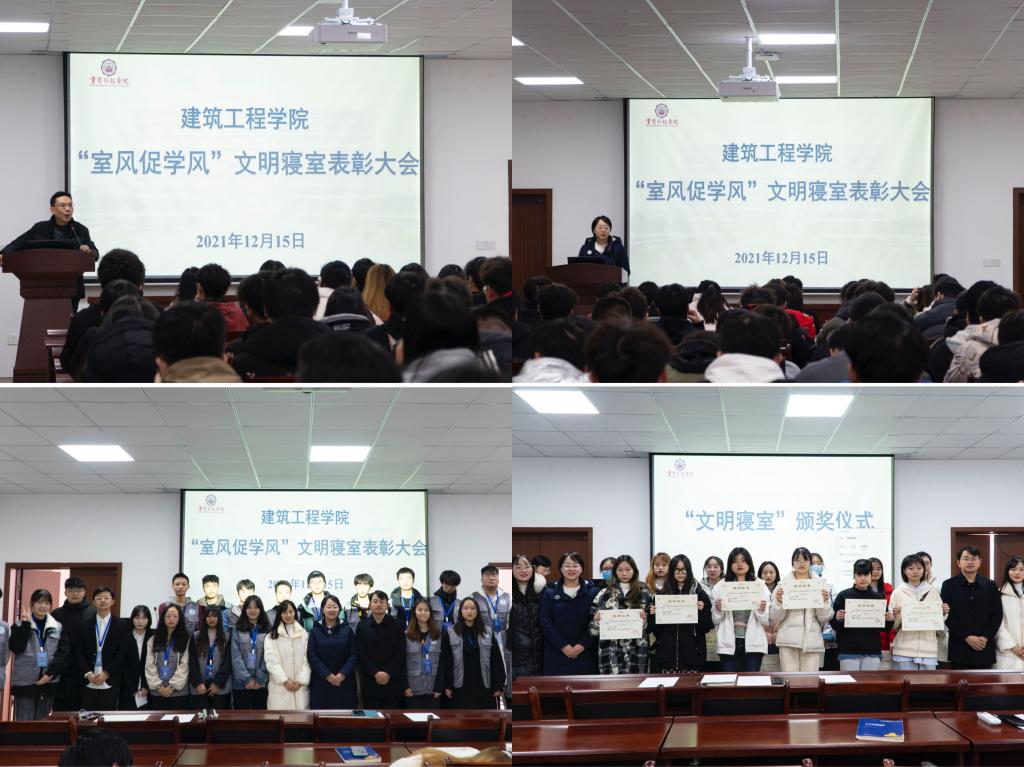 12月15日,建筑工程学院2021-2022学年第一学期“室风促学风”文明寝室表彰大会在产教融合大楼M334会议室召开。学院党总支书记李加强、党总支副书记陈皎娇、学生工作办公室主任沈礼、公寓专干教师伍冬志、学生一支部书记宁轻以及文明寝室获奖代表,2020级、2021级各班班长、团支书,院自律委员会学生骨干参加了大会。