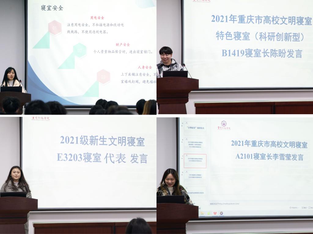 会上,伍冬志介绍了学院寝室工作和学生寝室清洁卫生检查评定标准,宣读了院级“文明寝室”表彰通知,并详细解读了《建筑工程学院寝室安全文明承诺书》及《建筑工程学院寝室通报批评处理办法》等文件,教师们为获奖寝室代表现场颁发了“文明寝室”奖状与奖品。随后,2021年重庆市高校文明寝室-特色寝室(科研创新型)B1419寝室长陈盼、2021年重庆市高校文明寝室A2101寝室长李雪莹、2021级新生文明寝室E3203寝室代表胡倩上台发言,从文明寝室的创建过程、寝室环境布置、寝室成员取得的成绩等方面进行了讲述,并分享了日常与室友相处的快乐点滴。