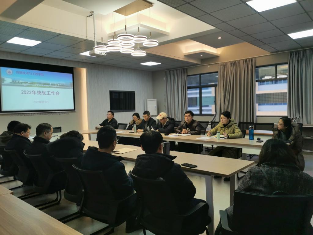 1月10日上午,智能技术与工程学院在逸夫楼I321会议室召开2022年统战工作会,学院班子成员、民主党派和无党派教师代表参会。会议由学院党总支书记都进学主持。