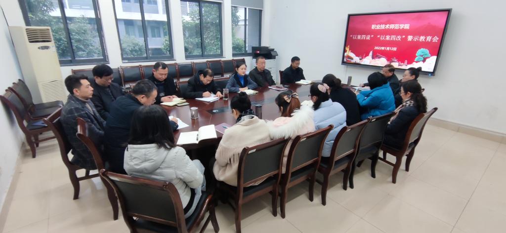 1月12日下午,职业技术师范学院在博学楼F121会议室召开“以案四说”“以案四改”警示教育会。会议由学院党总支书记赵萍主持。