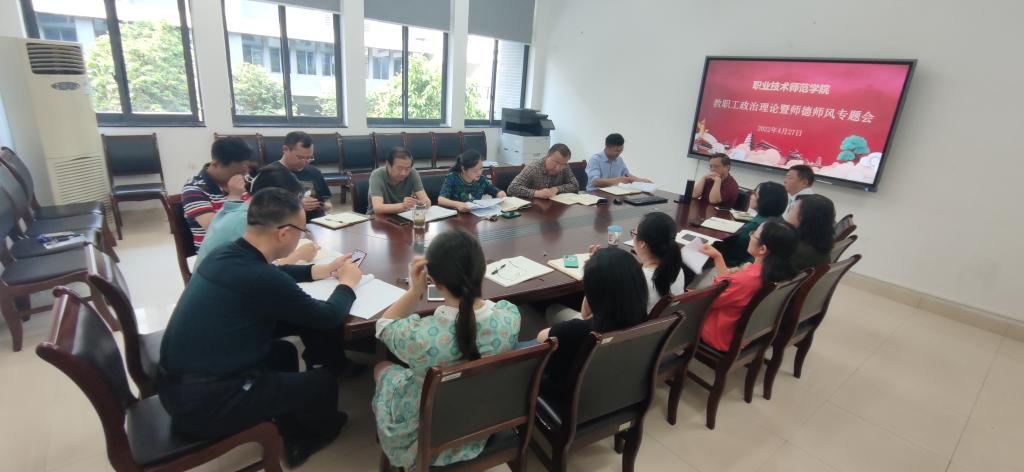 4月27日下午,职业技术师范学院在博学楼F121会议室召开教职工政治理论学习暨师德师风专题会,会议由学院党总支书记赵萍主持。