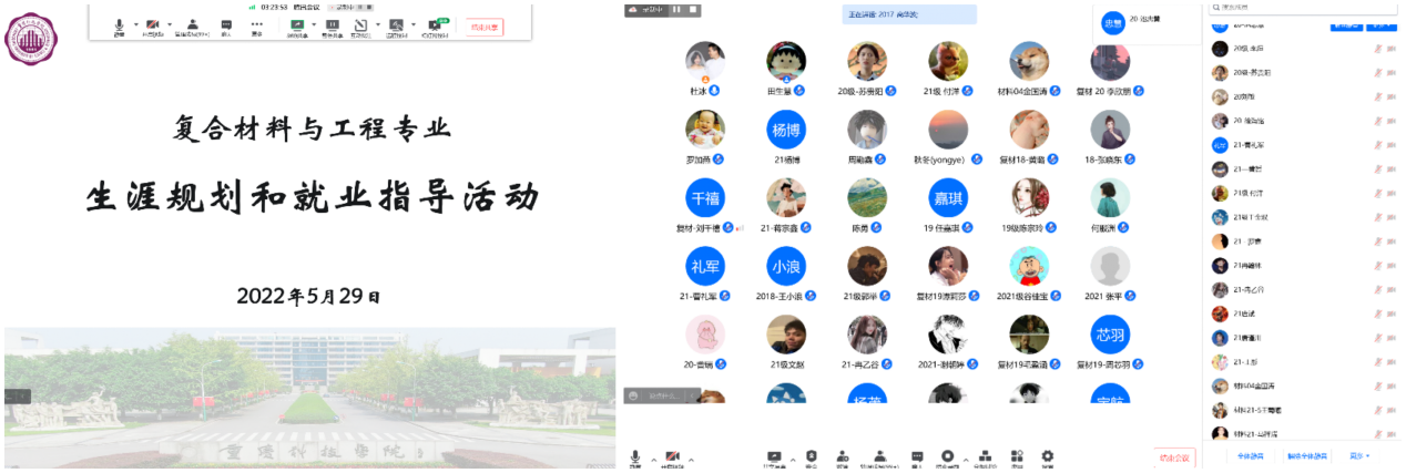 为引导复材学子树立正确的择业观,助力毕业生的人生规划和职业发展,5月29日,复合材料与工程专业线上开展了“五联动五讲五促”生涯规划和就业指导的活动。本次活动特别邀请到就业单位代表重庆国际复合材料有限公司人力资源部部长罗加燕和中蓝晨光化工研究设计院有限公司人事总监林杉,毕业学生王佳佳等为复材学子介绍公司情况并指导学生职业生涯规划,活动由杜冰主持。
