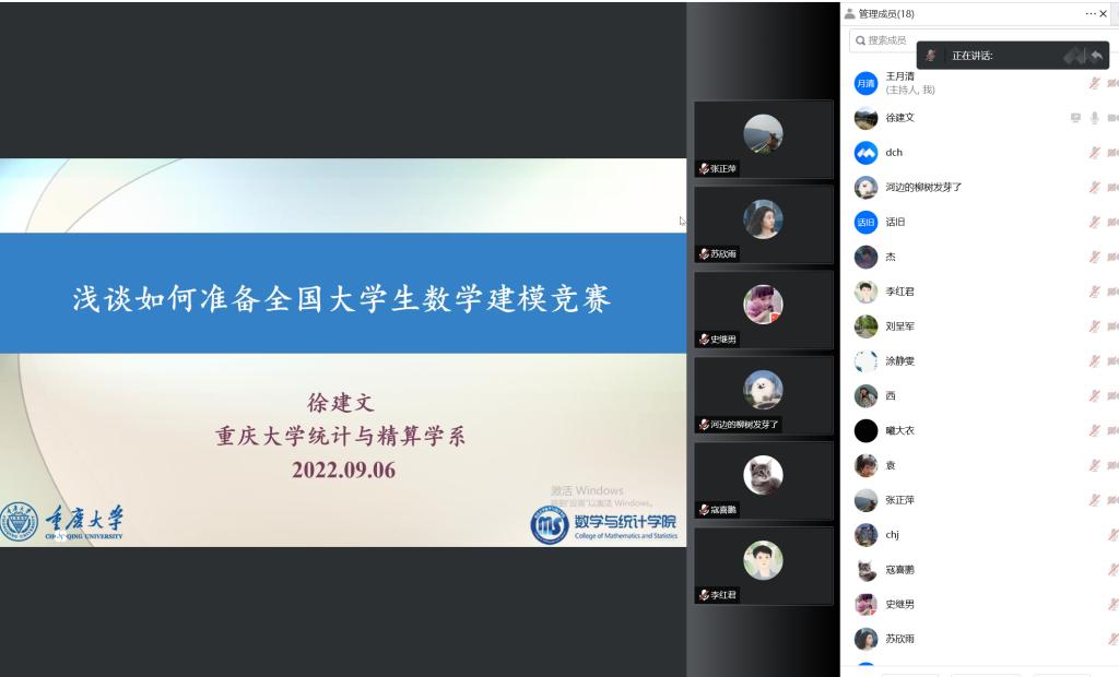 9月6日15:00,重庆大学数学与统计学院徐建文副教授应邀于线上为全体准备参加2022年全国大学生数学建模竞赛的师生做题为“浅谈如何准备全国大学生数学建模竞赛”的专题报告。报告由数理与大数据学院院长彭军教授主持,共计70余名师生参加了本次报告会。