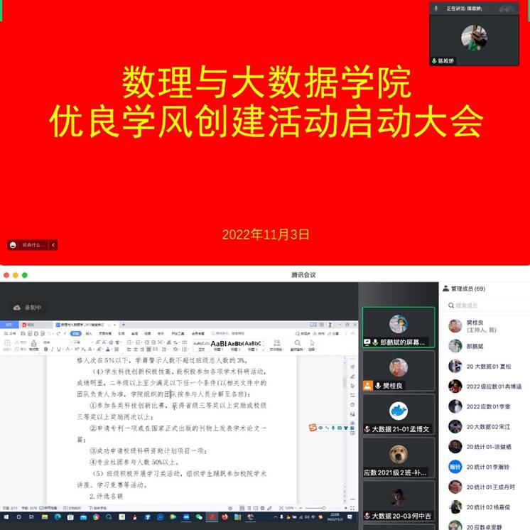 为进一步加强数理与大数据学院学风建设,培育优良学风,优化育人环境,营造良好的学习氛围。数理与大数据学院于11月3日晚上,召开学院优良学风创建活动启动大会。辅导员代表和2022级、2021级、2020级各班班长、团支书和学习委员以及团总支学生分会学生干部参会。会议由学院党总支副书记陈皎娇主持。