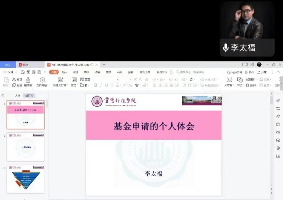 会议邀请了学校创新创业学院院长李太福教授作了题为“基金申请的个人体会”的报告。李太福教授结合具体的实例,针对科技文献搜索与阅读技巧、基金项目申报中创新点的提炼方法、申请书撰写技巧、利用知识可视化美化申报书等方面,进行了精彩的讲解。