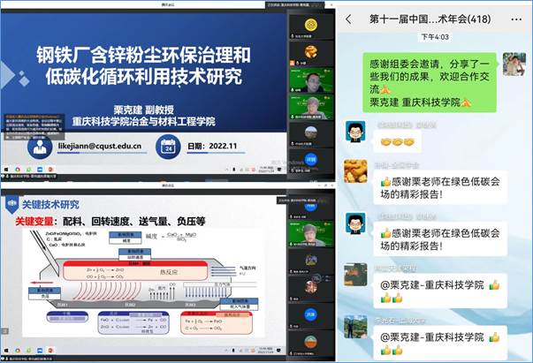 栗克建以“钢铁厂含锌粉尘环保治理和低碳循环利用技术研究”为题,介绍了国内外钢铁冶炼含锌粉尘固废的资源回收利用现况,分析了我国处置含锌粉尘处置过程中能耗高、结圈板结严峻等痛点问题,并介绍了我校冶金与材料工程学院相关最新研究成果,获得会议主办方和参会代表一致好评。本次大会为全国钢铁企业、冶金类高校、院所提供了交流平台,与会代表围绕建设绿色、低碳、智能、可持续发展的钢铁工业进行了深入研讨。