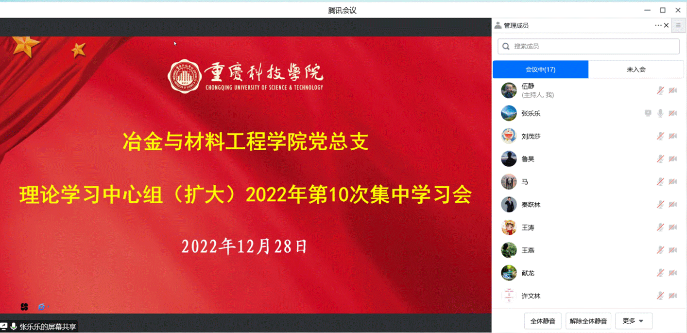 12月28日上午,冶金与材料工程学院党总支通过腾讯会议召开理论学习中心组(扩大)2022年第10次集中学习会。学院全体班子成员、党总支委员参加会议,各党支部书记列席会议。学院党总支书记张乐乐主持会议。