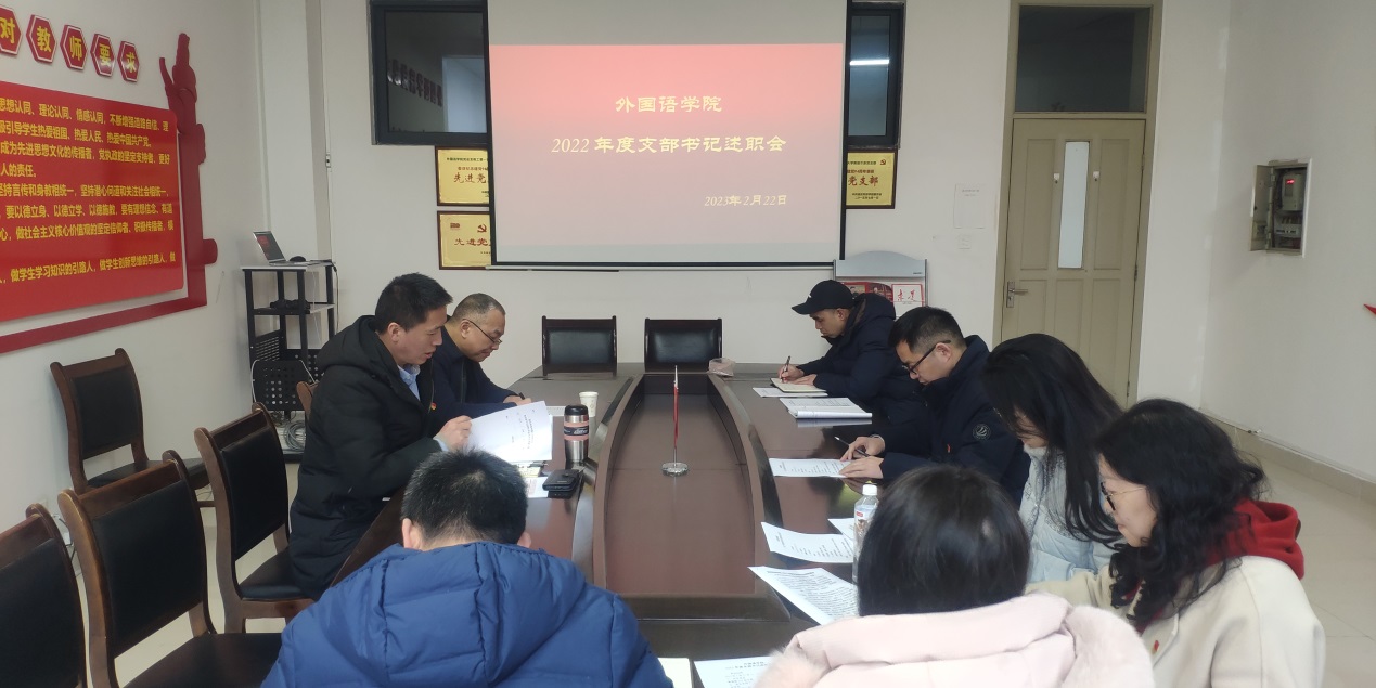 2月22日下午,外国语学院党总支在厚德楼206会议室召开2022年度党支部书记述职会。数理与大数据学院正处级组织员何光明同志列席会议,学院党总支委员、支部书记、教师代表参会,党总支书记余学兵主持会议。