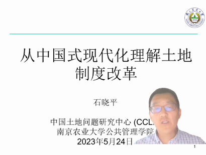 5月24日,全国MPA教指委委员、南京农业大学石晓平教授应邀为法政与经贸学院师生做题为“从中国式现代化理解土地制度改革”的学术讲座。该讲座为法政与经贸学院公管.博学大讲堂之名家系列讲座之一。法政与经贸学院院长杨贵中教授主持,MPA研究生及导师共100余人线上参会学习。