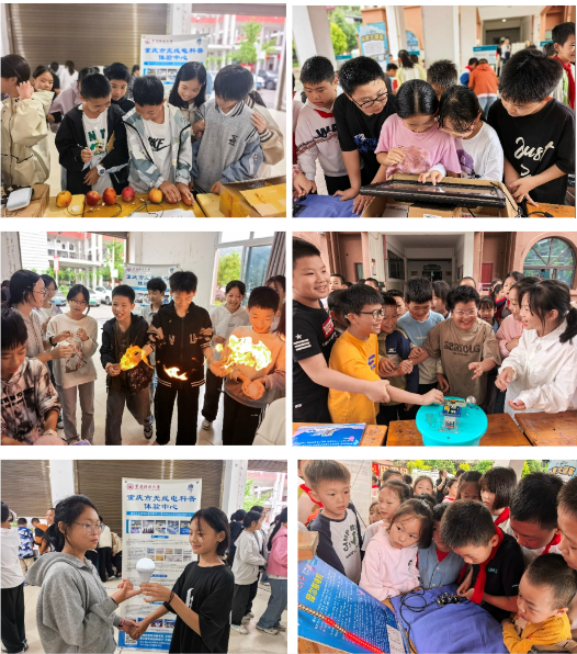黔江区育才中学、舟白中学的活动现场,“火焰掌”实验率先引爆全场。科普老师将混有可燃气体的泡沫轻敷在学生掌心,火焰在指尖跳跃,却未伤及皮肤,惊呼声与掌声此起彼伏;“水果钢琴”展区前队伍蜿蜒,孩子们将手指轻按在连有电路的苹果上,清脆旋律随之流淌,在悦耳声响中直观解锁导体与电路的奥秘;“闪电画”区域更成视觉焦点,孩子们屏息凝视,看着“闪电”在画板上蜿蜒游走,转瞬勾勒出树木轮廓,抽象物理原理瞬间化作可触可感的艺术。