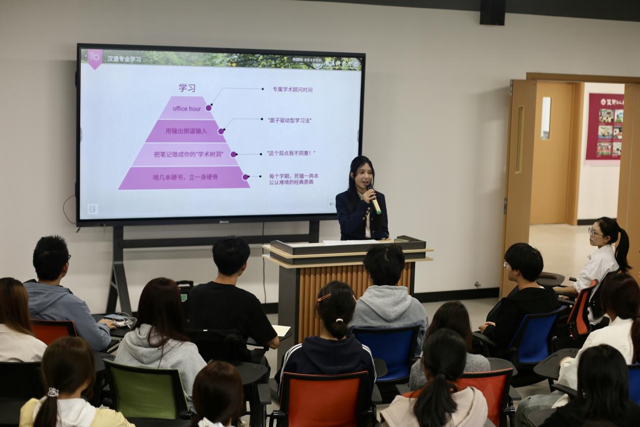 为营造互助共进的学习氛围,助力新生适应大学生活、明确发展方向,10月22日下午,设计与人文学院在博闻楼J314教室开展优秀学生分享会。本期特邀雷逸涵、李乐、谢欣渝、樊浩四位优秀的高年级学生代表分享经验,吸引了百余名学生参与,大家围绕学习与生活展开深入交流。