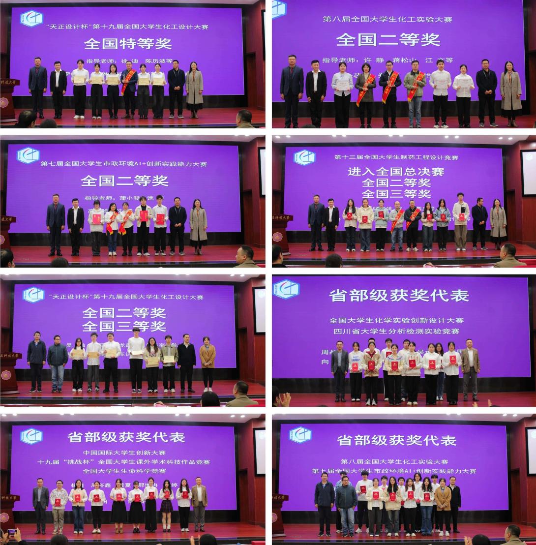 学院班子成员为获奖师生颁奖。党总支书记杨睿宇在总结中充分肯定竞赛成绩,并宣布自2026年起学院将推出领导带队、专项配套、评优优先等多项支持措施,鼓励全院师生积极备赛、再创佳绩,为学校高质量发展贡献化工力量。