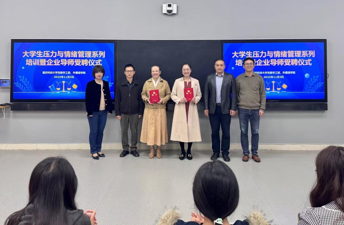 为进一步帮助学生掌握科学、系统的心理调适方法,培养积极阳光的健康心态,11月3日,外国语学院在主教学楼B215智慧教室举办“大学生压力与情绪管理”系列培训暨企业导师受聘仪式。党委学生工作部部长何亮、心理健康教育与咨询中心主任向守俊及相关学院负责人受邀参加,以及来自不同学院的30余名学生共同参与。活动由外国语学院党总支副处级组织员许文林主持。