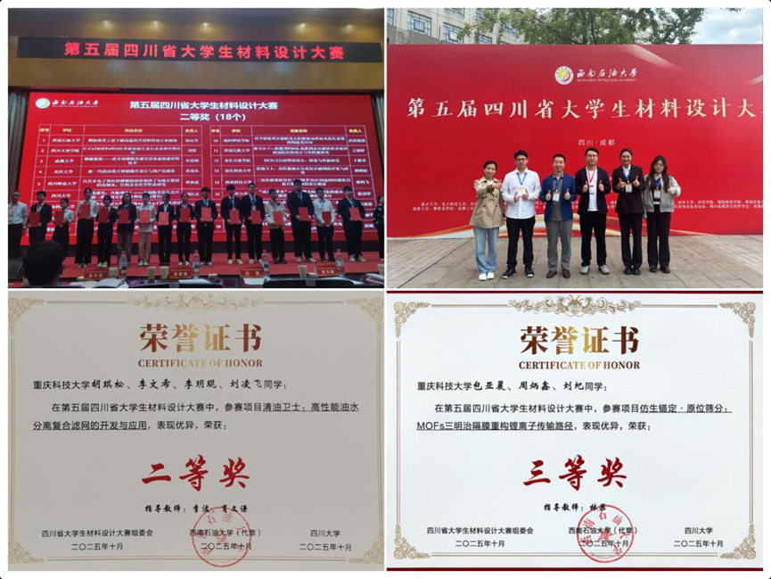 近日,2025年第五届四川省大学生材料设计大赛决赛在西南石油大学落幕。我校材料与新能源学院学生的项目“清洁卫士:高性能油水分离复合滤网的开发与应用”(参赛学生:胡琪松、李文希、李玥琨、刘凌飞,指导教师:李波、肖文谦)和“仿生锚定·原位筛分:MOFs三明治隔膜重构锂离子传输路径”(参赛学生:包亚晨、周炳鑫、刘旭,指导教师:林果)分别荣获二等奖和三等奖。