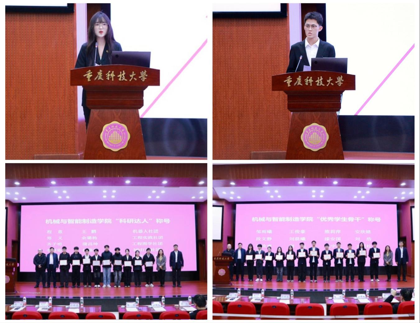 为树立笃学奋进、实干担当的学风典范,在表彰环节,程意、王鹏等9名同学荣获“科研达人”称号,邹雨曦、王俊豪等12名学生获评“优秀学生骨干”。表彰结束后,优秀学生骨干代表邹雨曦与新生代表李柏汉先后登台分享:邹雨曦结合自身经历,分享了在学业、竞赛与学生工作中的宝贵心得,生动诠释了“勤学善思、实干笃行”的成长路径;新生代表李柏汉则畅谈了入学以来的感悟与未来规划,展现了新一代机械学子的朝气与担当。两位代表的分享以朋辈榜样力量传递了宝贵经验,为在场学子注入了强劲的奋进动力。