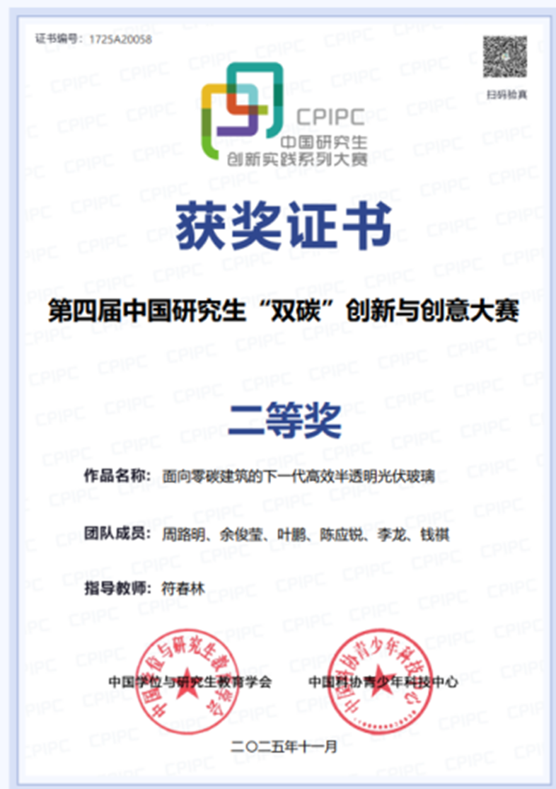 11月7日至9日,第四届中国研究生“双碳”创新与创意大赛全国总决赛在沈阳化工大学举办。材料与新能源学院教授符春林指导的研究生团队(周路明、余俊莹、叶鹏、陈应锐、李龙、钱祺)凭借项目“面向零碳建筑的下一代高效半透明光伏玻璃”荣获全国二等奖。