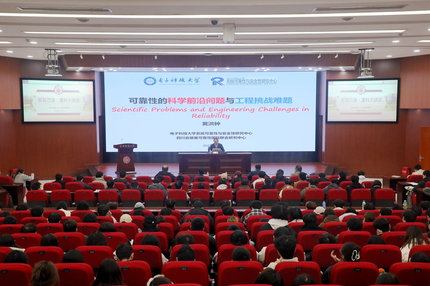 11月27日上午,电子科技大学科技委副主任、电子科技大学系统可靠性与安全性研究中心主任、国家杰出青年科学基金B类获得者黄洪钟教授应邀做客我校“智荟巴渝·重科大讲堂”,为我校师生作“可靠性领域的科学前沿问题与工程挑战难题”主题学术报告。科技处、机械与智能制造学院、安全科学与工程学院相关负责人以及300余名师生代表在学术报告厅聆听报告。报告由科技处处长谭先锋主持。