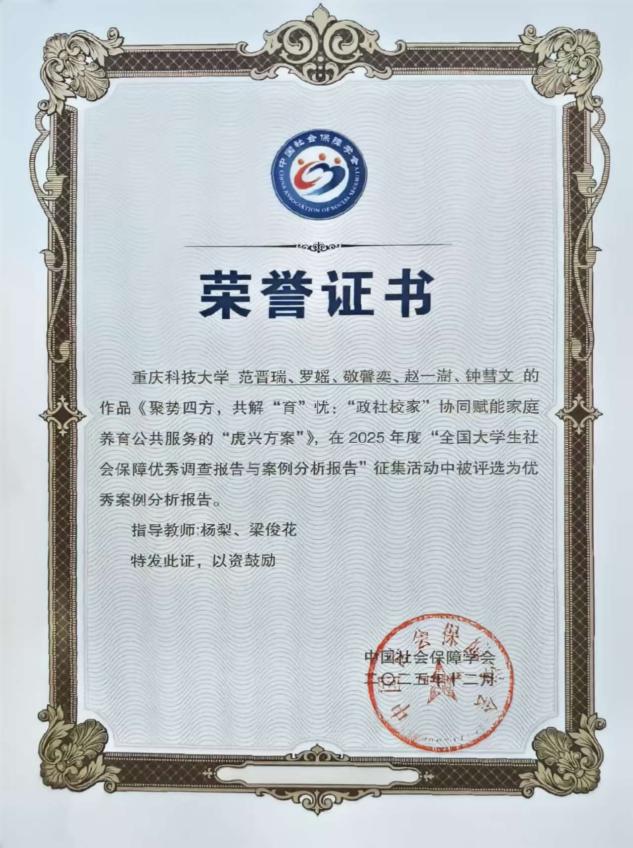 12月6日,第四届“全国大学生社会保障优秀调查报告与案例分析报告”成果分享会在华中师范大学南湖校区举办,我校参赛学生受邀参会并做汇报。由我校杨梨、梁俊花老师指导的作品《聚势四方,共解“育”忧:“政社校家”协同赋能家庭养育公共服务的“虎兴方案”》荣获“优秀案例分析报告”奖。这是我校连续第四次在该活动中获奖,体现了我校劳动与社会保障专业人才培养方面的持续成效。