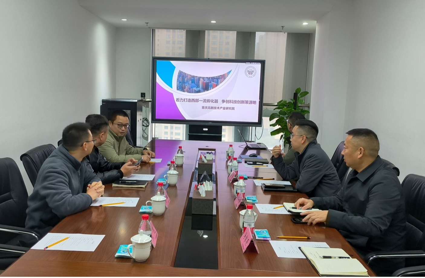 陶秋副总经理对学院一行表示热烈欢迎,并介绍了研究院基本情况。重庆高新技术产业研究院是重庆市推动科技创新与成果转化的综合性服务平台,重点培育战略性新兴产业和高新技术企业,能够对师生依托创新自身研究成果开展创新创业提供商业价值评估、市场需求对接、中试设施场地、企业落地、天使轮融资等全程陪跑服务。作为重庆市高新技术产业孵化与转化核心平台,聚焦新材料、智能制造、环保技术等领域积极开展创新布局。田勤思详细介绍了学院在学科建设、人才培养及科研平台方面的基本情况。双方就毕业生就业需求、实习基地共建、科研项目联合攻关、师生创新创业等议题进行了务实讨论,一致认为在高新技术快速迭代的背景下,校企协同对于提升人才创新创业能力与推动技术落地至关重要。