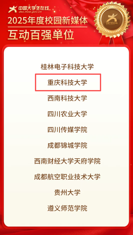 中国大学生在线是由教育部主管主办,教育部思政司指导,高等教育出版社承办,全国高校合作共建,全国大学生参与的公益性、综合性大学生网站,是国内最大的面向全国大学生开展思想政治教育的主题教育网站,品牌活动覆盖全国3000余所高校。其年度互动百强评选围绕内容质量、互动效能、思政融入等关键维度综合考评出天津大学、山东大学、西南大学、重庆科技大学等一百所高校。这一荣誉,是学校统筹推进“大思政”建设的重要成果,更是对我校新媒体矩阵建设和网络思政育人实践的充分肯定。