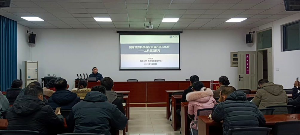 为进一步推动2026年国家自然科学基金项目申报工作,助力教师提升项目书撰写质量与立项成功率,2026年1月22日下午,西南大学电子信息工程学院副教授车杭骏应我校数理科学学院邀请,在厚德楼G408作题为《国家自然科学基金申请心得与体会——从构思到撰写》的专题辅导报告。数理科学学院拟申报2026年度国家自然科学基金项目的教师积极参加本次报告。