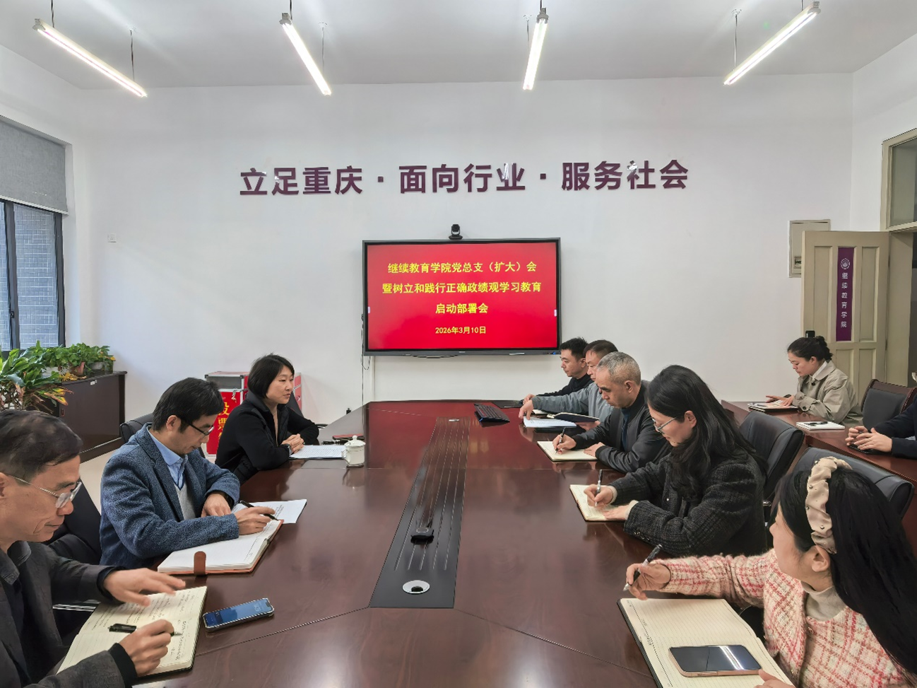 3月10日下午,继续教育学院在博学楼F121会议室召开党总支(扩大)会,部署树立和践行正确政绩观学习教育工作。全院党员教职工参会,继续教育学院党总支书记张莹主持会议。