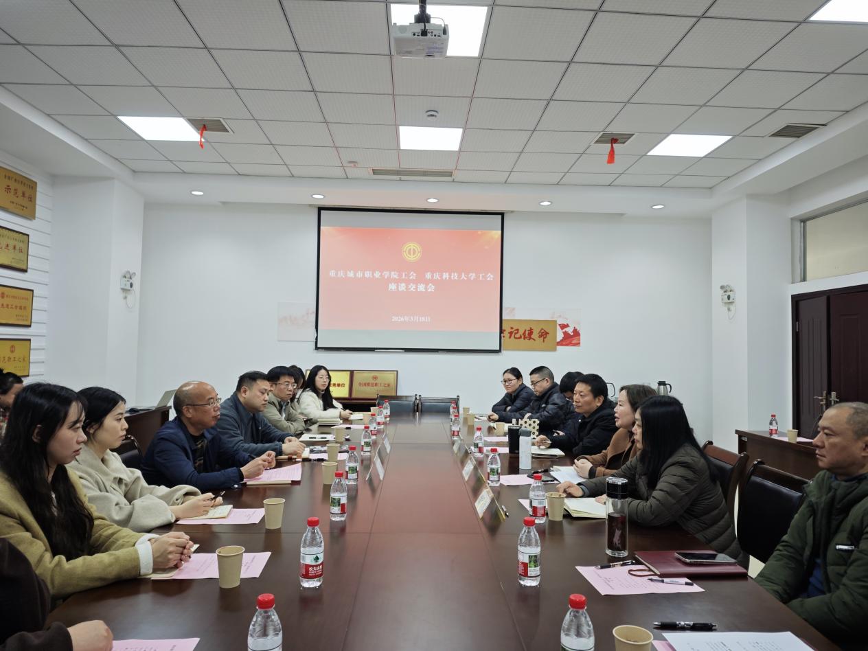 3月18日上午,重庆城市职业学院副校级干部、工会主席文斌,工会副主席潘峰一行来校调研交流。座谈会在教职工活动中心314会议室举行,学校工会、计划财务处及分工会相关人员参加会议,校工会常务副主席彭渝主持座谈会。