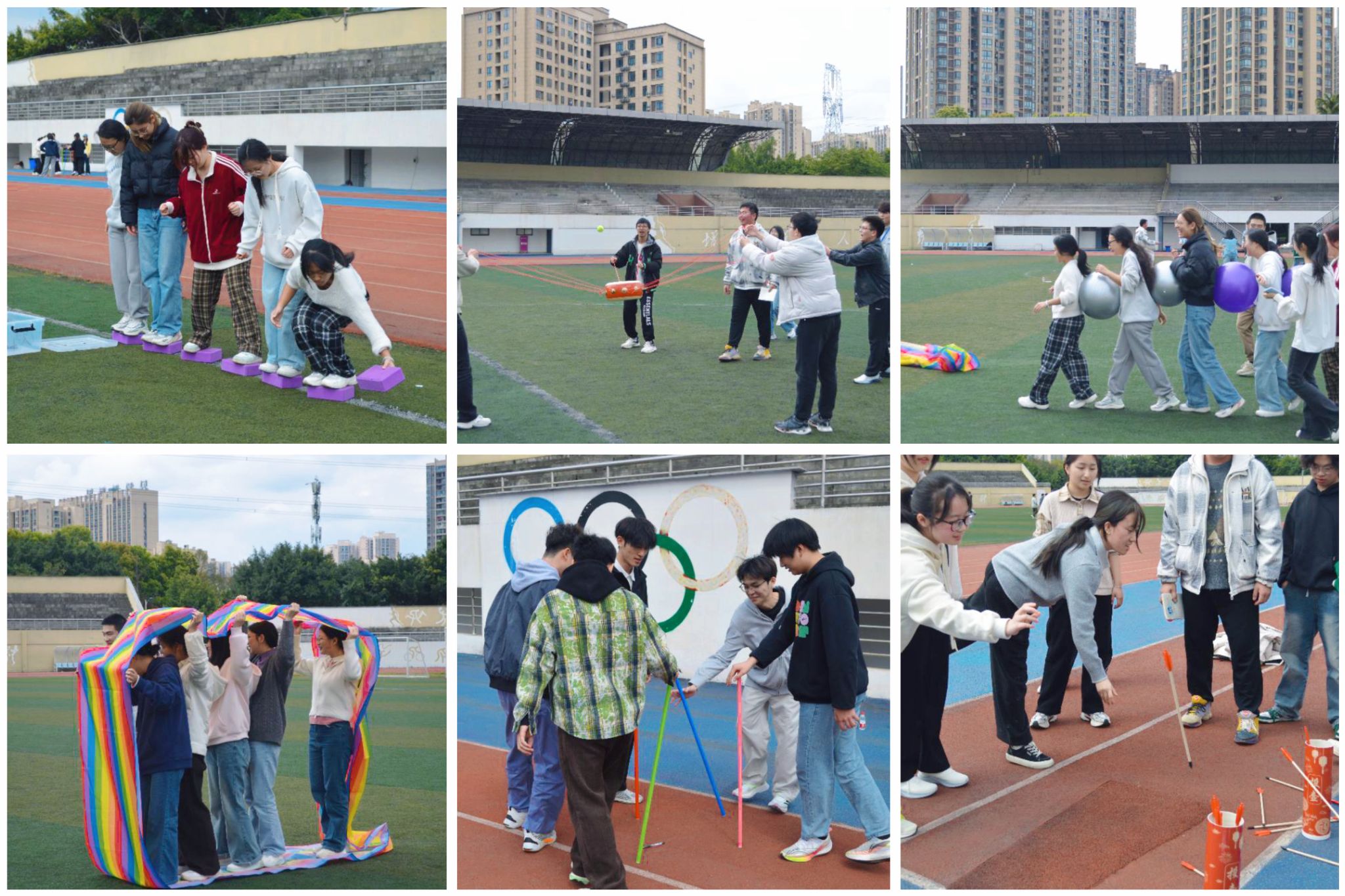 袋鼠跳接力赛、投票纳财、同心振鼓、不倒森林、摸石头过河、风火气球赛等项目各具特色:袋鼠跳培养坚持与担当,俄罗斯方块提升逻辑与耐心,投壶引导平和心态,同心振鼓彰显团结力量,不倒森林强化信任配合,摸石头过河传递陪伴支持,风火气球赛释放青春活力,每项挑战都助力学生心灵成长。