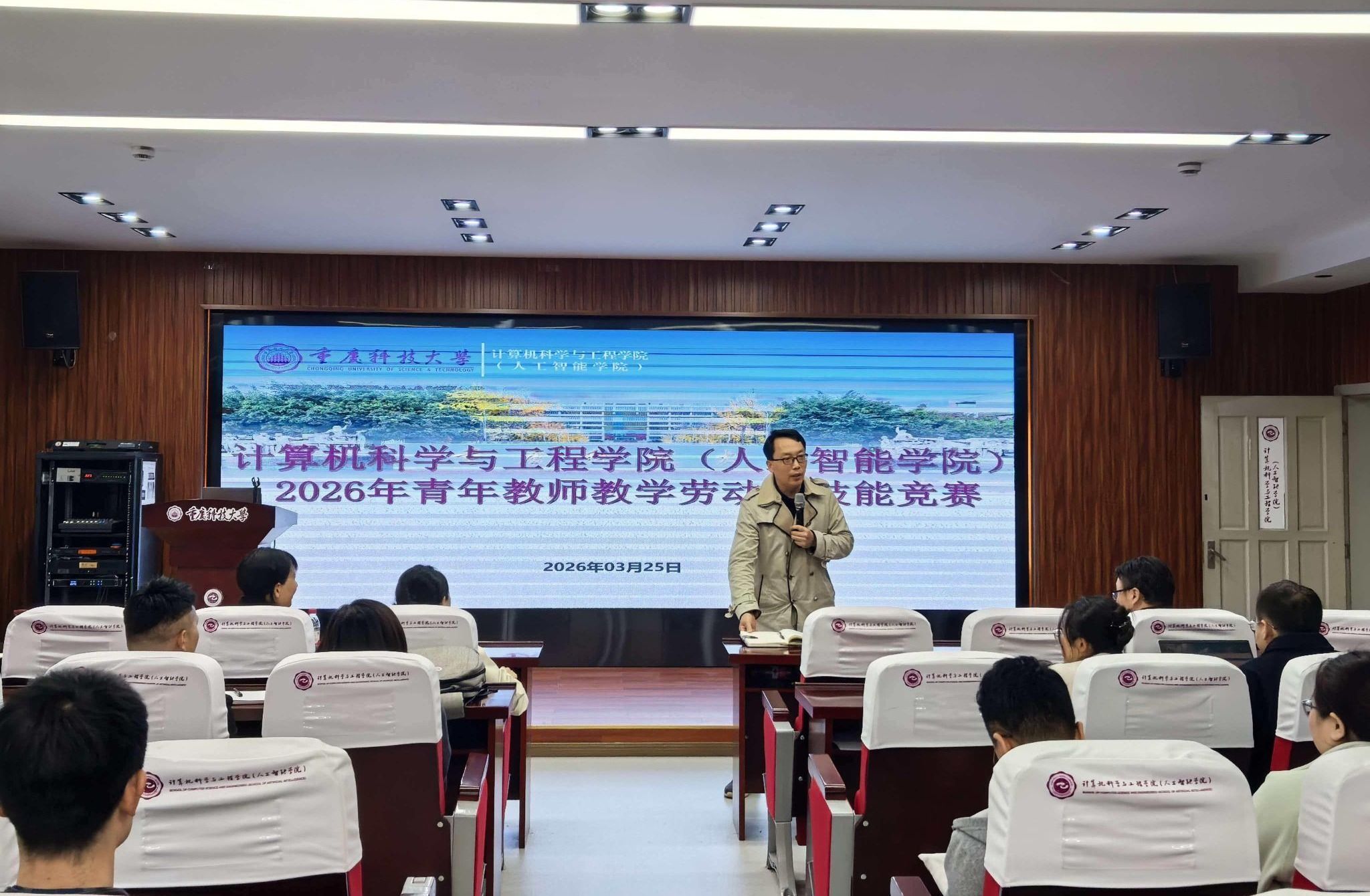 为进一步激发青年教师更新教育理念和掌握现代教学方法的热情,努力造就一支有理想信念、有道德情操、有扎实学识、有仁爱之心的高素质、专业化青年教师队伍,推动我院教育事业高质量发展,3月25日上午,计算机科学与工程学院(人工智能学院)举办学院2026年青年教师教学劳动和技能竞赛,来自计算机系、物联网工程系、软件工程系和智能科学与技术系、基础系共19名青年教师分三组参加了比赛。比赛由教学副院长雷亮主持,学院特邀9名校内外教学名师、教学创新大赛国赛获奖教师、教学督导等组成评审团,严格评审确保公平公正。