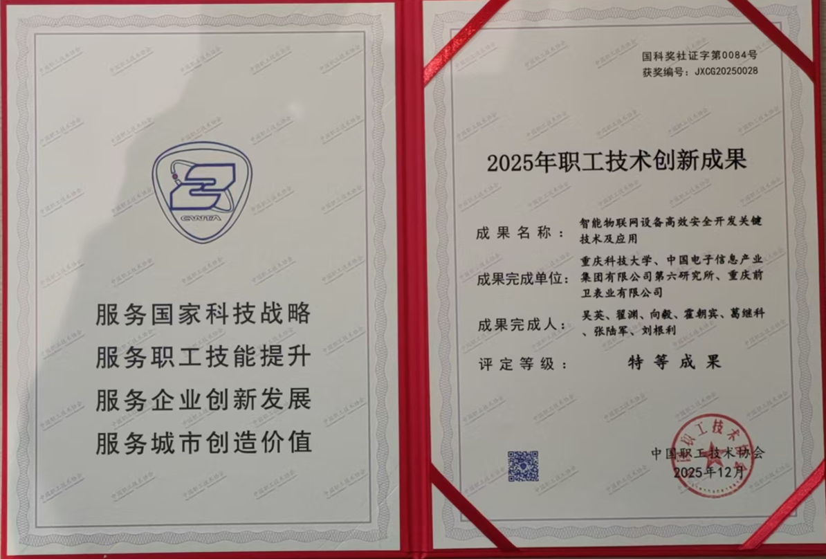 近日,中国职工技术协会网络安全专业委员会一届四次会员全体会议在深圳举行。会上为中国职工技术协会2025年创新成果获奖代表颁奖。我校计算机科学与工程学院(人工智能学院)牵头,联合中国电子信息产业集团有限公司第六研究所、重庆前卫表业有限公司申报的“智能物联网设备高效安全开发关键技术及应用”项目获评特等成果。