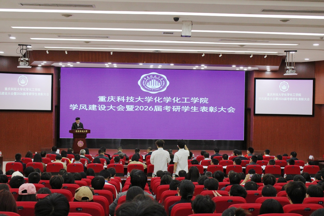 为表彰考研先进典型,深化优良学风建设,引导广大学生立志成才、勤勉向学,4月22日下午,化学化工学院学风建设大会暨2026届考研表彰大会在学术报告厅召开。学校党委学生工作部部长何亮、教务处处长秦跃林、研究生院院长蔡苇、招生就业处处长邓艇,化学化工学院班子成员及师生代表参加大会,会议由化学化工学院党总支书记杨睿宇主持。