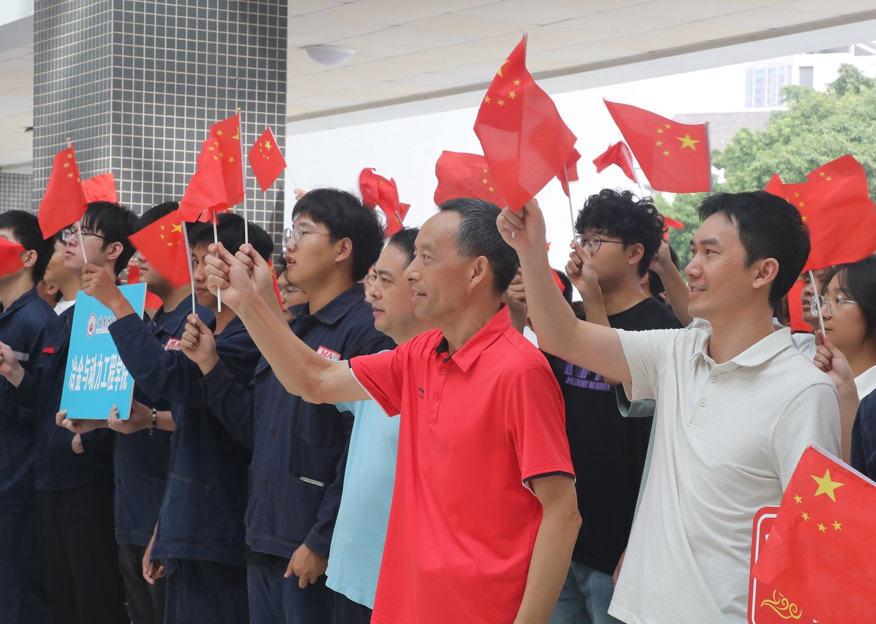 教学主楼大厅内,鲜艳的五星红旗熠熠生辉,现场气氛庄重而热烈。活动在《今天是你的生日》的轻柔旋律中拉开序幕,黎德龙书记与师生代表共同吟唱,目光汇聚于国旗,将对祖国母亲的深深祝福融入每一个音符之中。随后,《大中国》的豪迈旋律激昂奏响,师生并肩高歌,“我们都有一个家,名字叫中国”的歌声响彻全场。大家手持小国旗整齐挥动,汇聚成一片象征炽热爱国情的“红色浪潮”。最后,《我和我的祖国》经典旋律悠然回荡,钢琴与管乐深情和鸣,全体师生齐声唱响“我和我的祖国,一刻也不能分割”,深情的歌声穿透大厅,充分展现了新时代重科师生“强国有我”的坚定信念与使命担当。