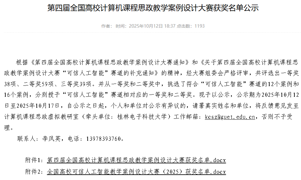 近日,第四届全国高校计算机课程思政教学案例设计大赛由教育部高等学校计算机类专业教学指导委员会指导、桂林电子科技大学承办,聚焦计算机课程思政教学改革,旨在推动课程思政与专业教学的深度融合。经大赛组委会严格评审,我校计算机科学与工程学院(人工智能学院)符玥、杨怡康、刘玉川、刘博文教师团队的《“互联网 +”背景下 C 语言程序设计课程思政教学案例》在本次大赛中荣获二等奖。